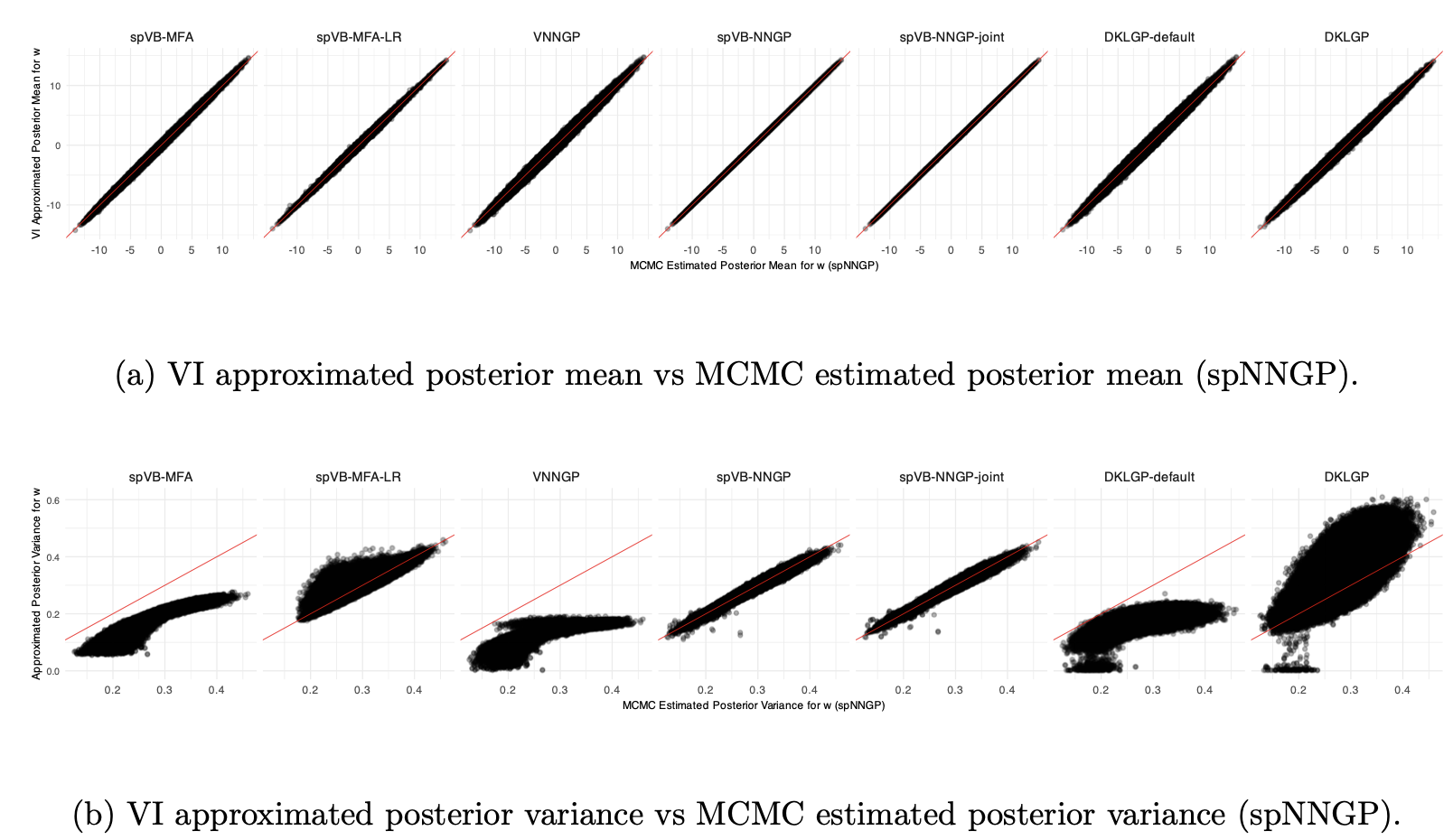 spVarBayes: An R package for fast variational Bayesian inference in large-scale geospatial regression using NNGP. It leverages closed-form gradient updates and linear response corrections to achieve calibrated uncertainty at reduced computational cost. A tutorial is available.